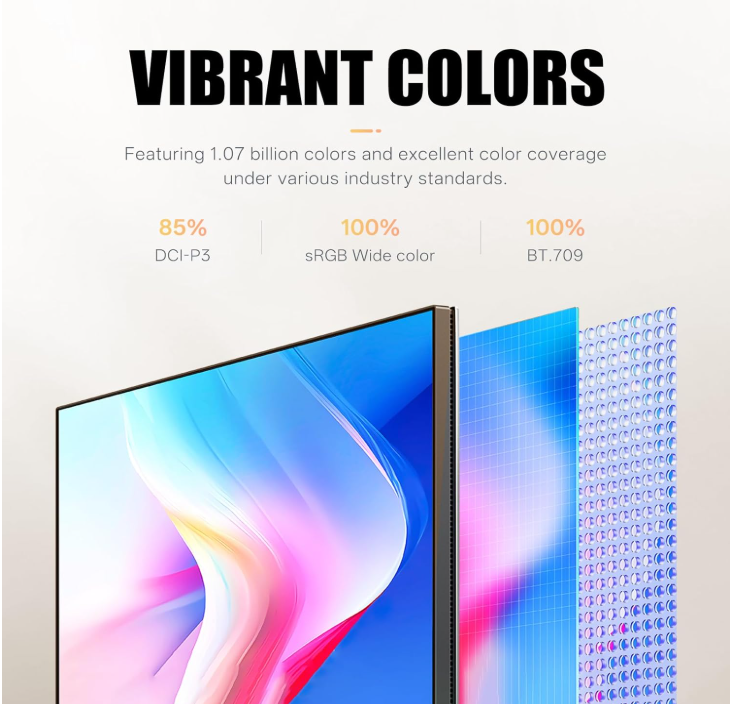 100% sRGB, 100% BT.709, and 85% DCI-P3 color coverage